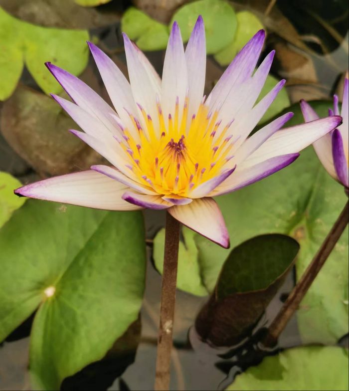睡莲,系睡莲科睡莲属多年生水生草本花卉。因其花色艳丽,花姿楚楚动人,在一池碧水中宛如冰肌脱俗的少女,而被人们赞誉为“水中女神”。